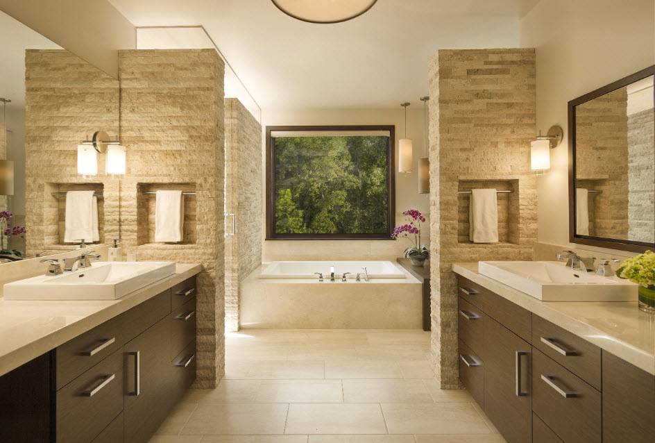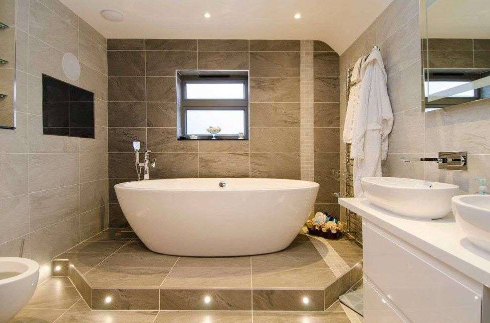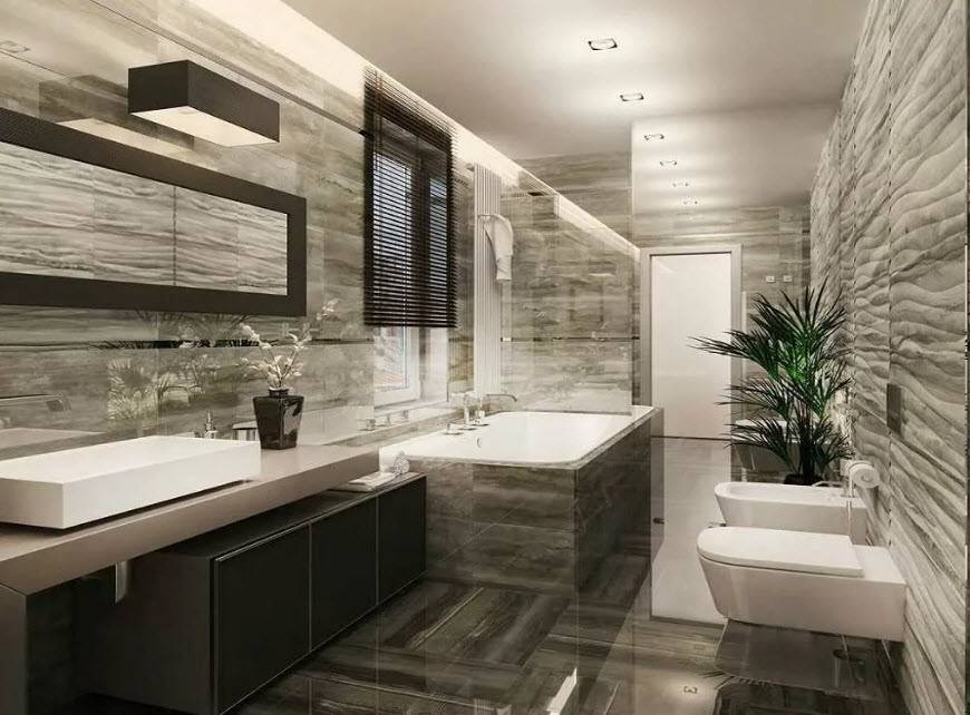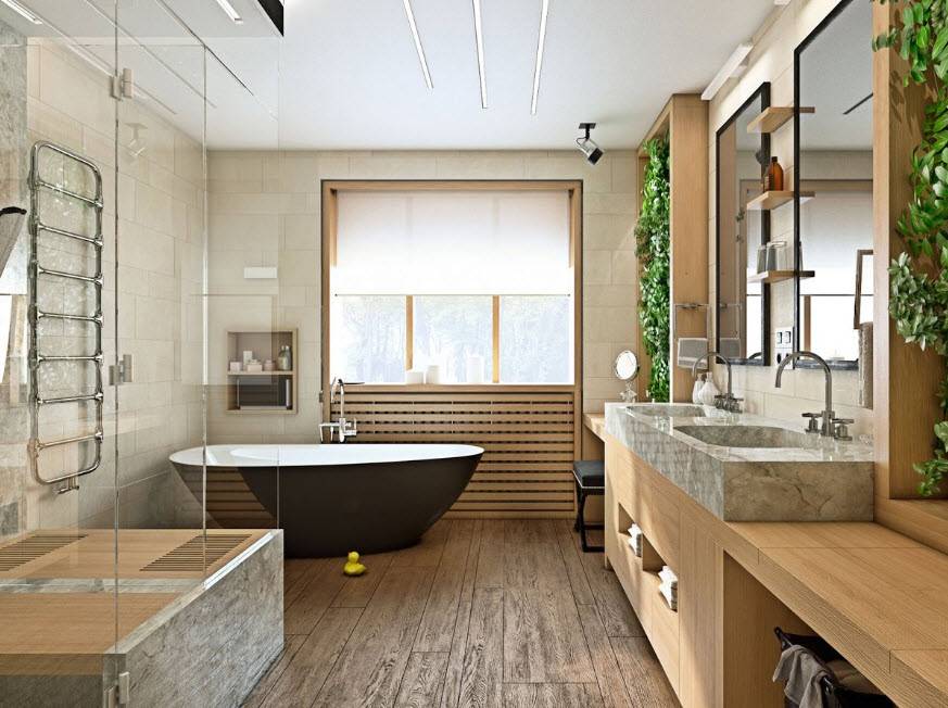 Если санузел большой, можно разделить его на зоны. Для этого используются ниши, подиумы, перегородки