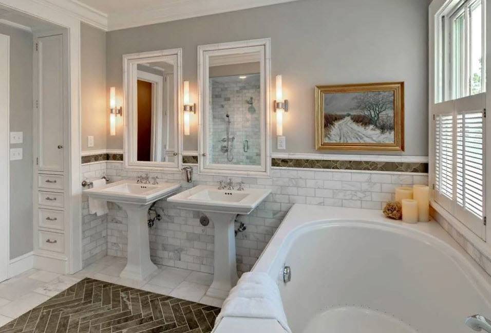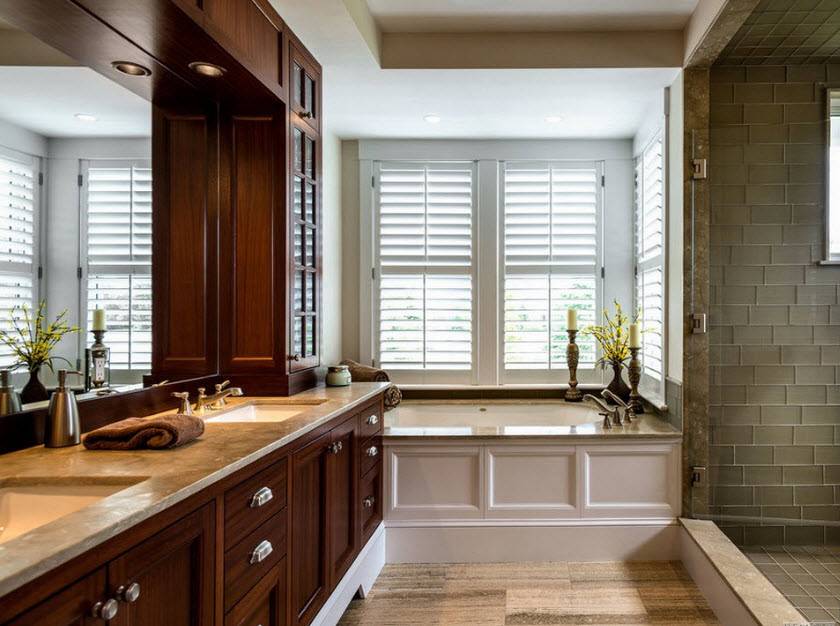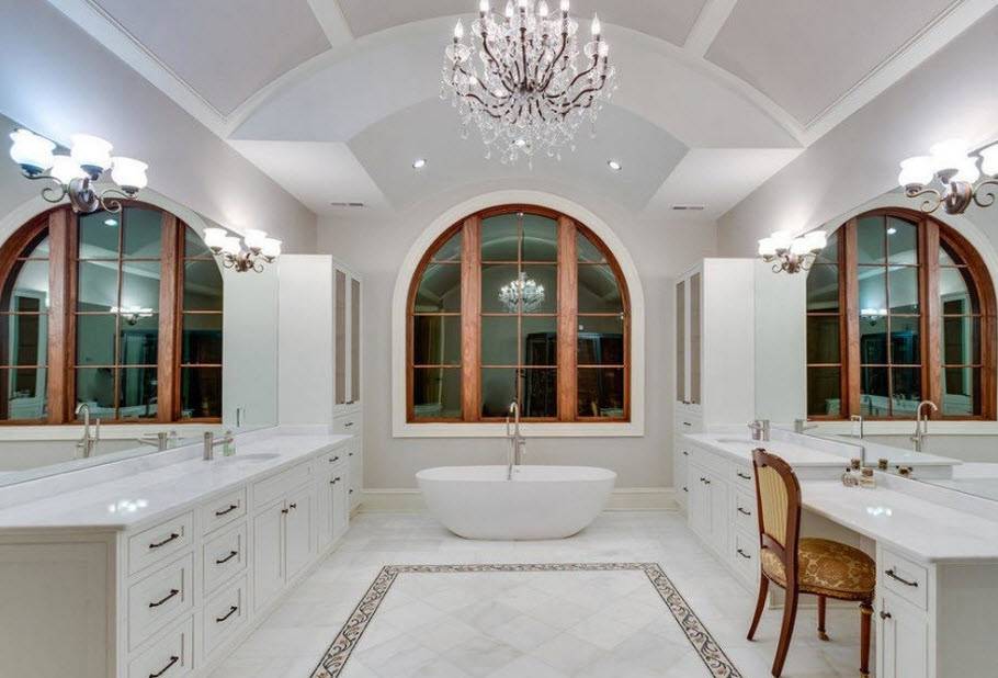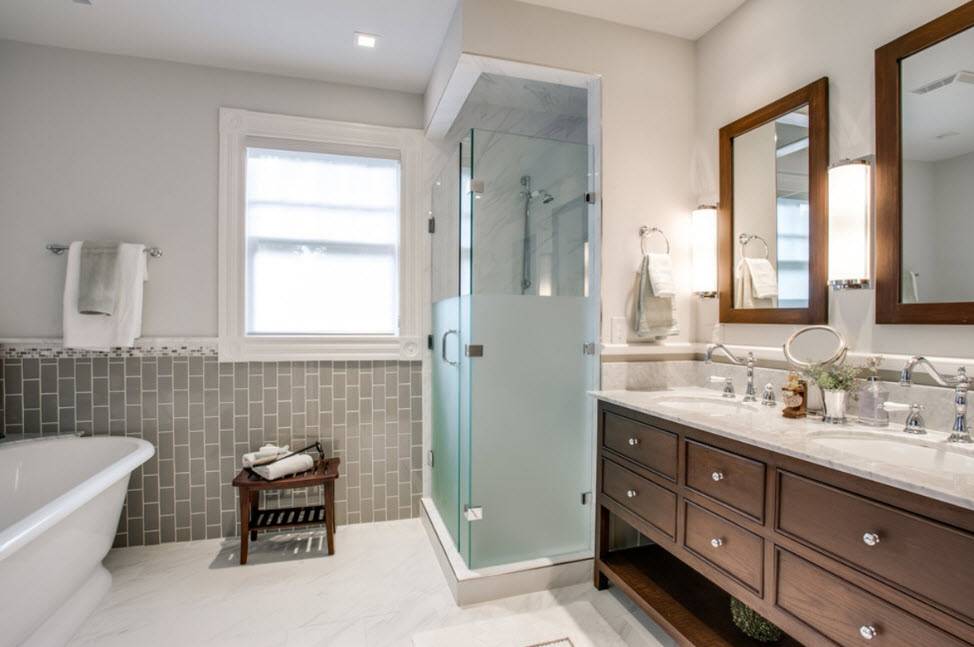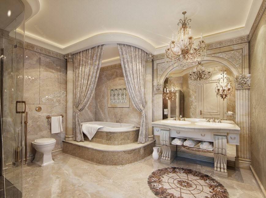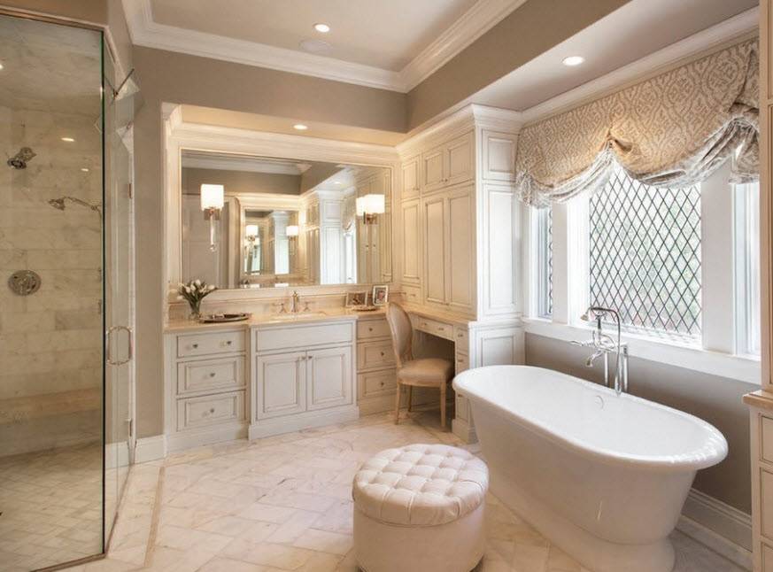 Это направление отлично справится с задачей подчеркнуть презентабельность и утонченность интерьера. Отличительной чертой такого дизайна можно называть универсальность и то, что он все течения времени всегда остается модным. Даже спустя много лет эта ванная комната будет актуальной как никогда. При оформлении в классическом стиле чаще всего отдают предпочтение материалам натурального происхождения, которые подчеркнут статус домовладельца и оригинальность помещения.