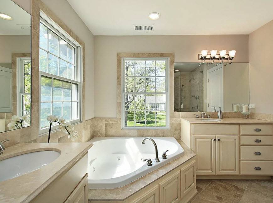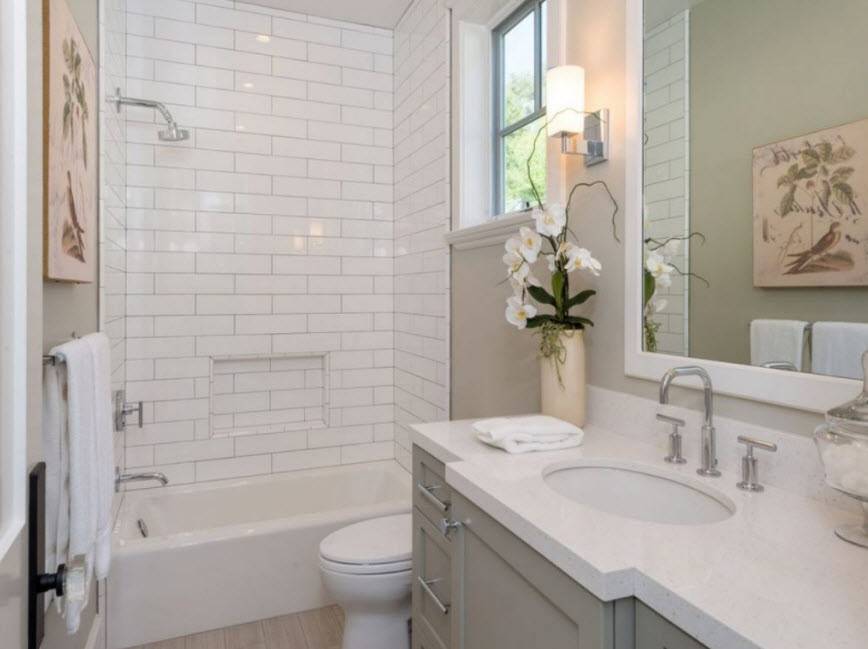 Ранее мы говорили о ванной комнате с окном. Так вот, в этом случае имеет смысл отделка комнаты в светлых тонах, чтоб в дневное время света с улицы хватало для освещения ванной. Но это дело вкуса, а потому выбирайте то, что вам больше нравиться.
