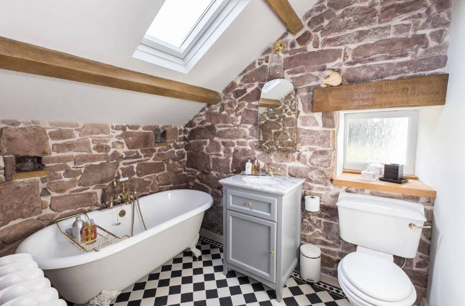Этот стиль уникален, и подойдет для тех домов, где для ванной отвели большое помещение с высоким потолком. Отделка в этом случае минимальная. Если дом бетонный или кирпичный, то можно даже не делать отделку, так как именно эти материалы являются основой для подчеркивания индустриального дизайна. При грамотном проектировании такого интерьера для ванной в загородном доме вы получите стильное помещение с небольшими затратами.