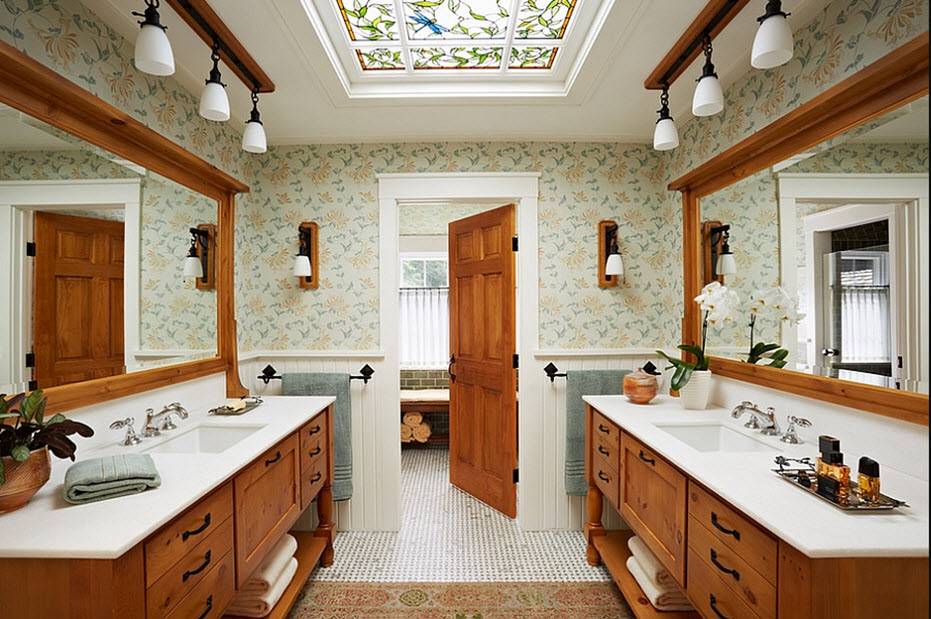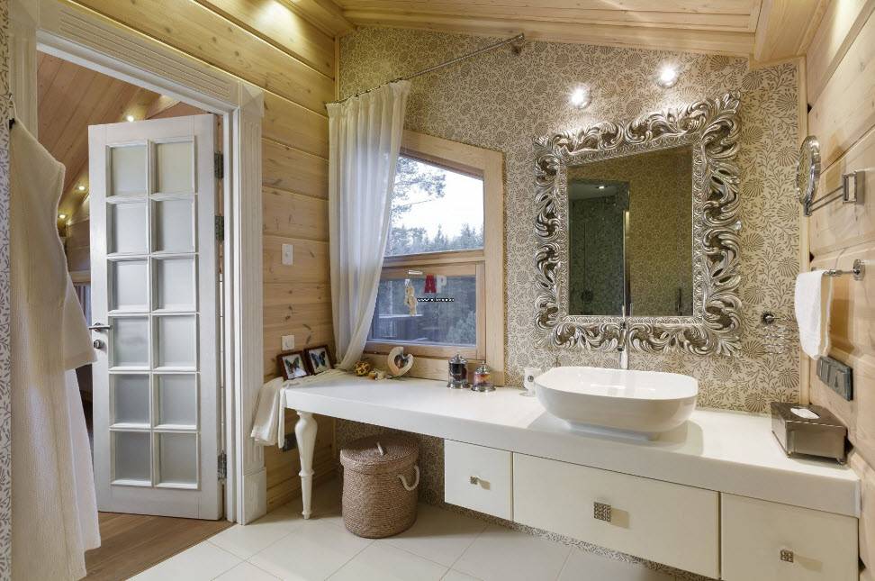 В последнее время при оформлении частного дома, особенно деревянного, принято использовать натуральные материалы, как для отделки, так и выбора декора. В то же время нужно помнить, что ванная комната – это помещение с повышенной влажностью, где текстильные обои и древесина могут гнить, став источников грибка и плесени. Избежать этого можно, обработав древесину специальной пропиткой и антисептиками, защищающими материал от влаги.
