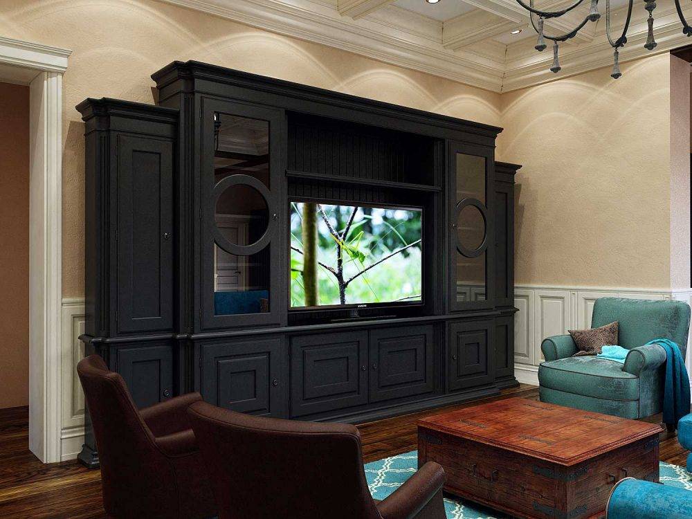 Большая модульная стенка отлично дополнит интерьер гостиной