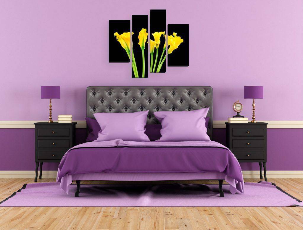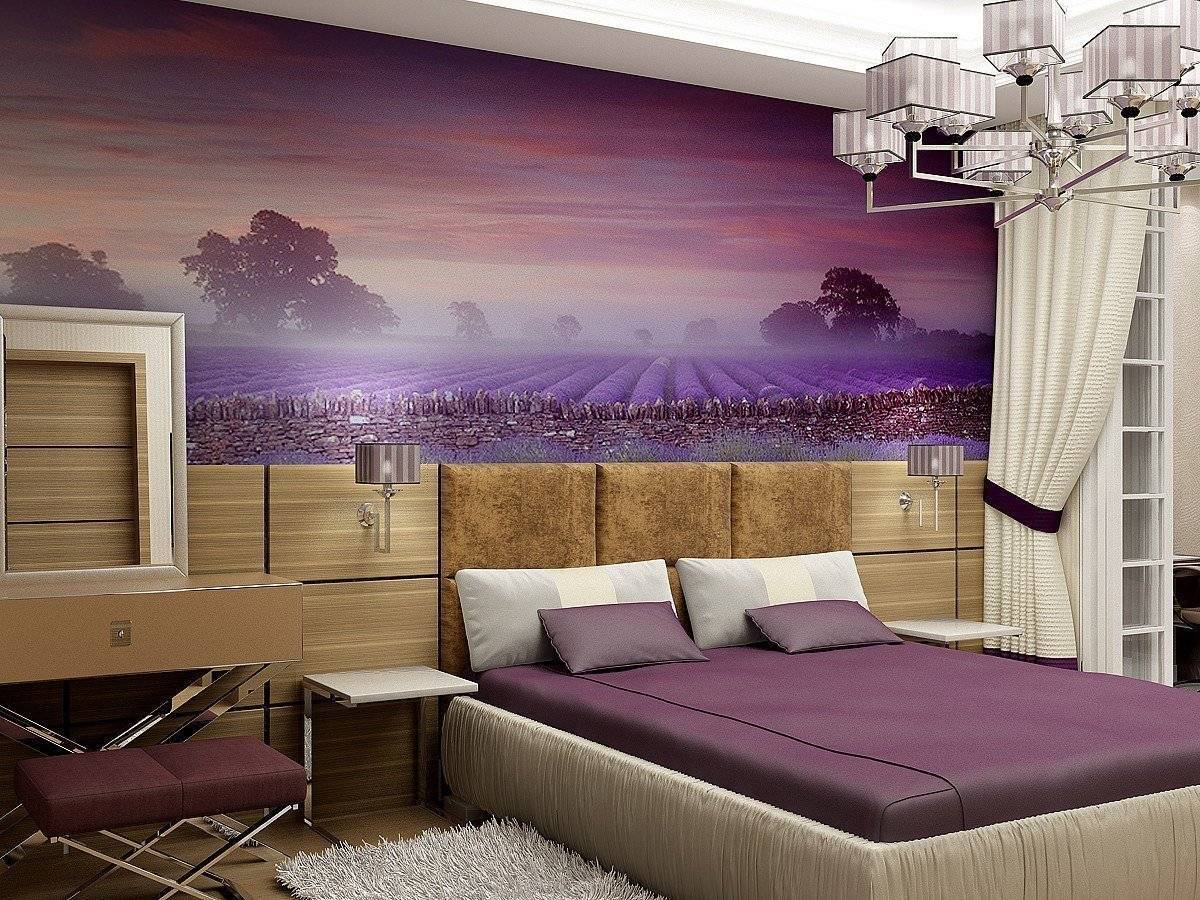 Лиловый цвет в интерьере супружеской спальни отлично сочетается с нотками нежной зелени и терпкостью пряных трав. Растительный орнамент или фотообои с крупным цветком – символ романтических отношений и торжество жизни