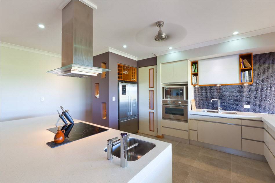 Холодная палитра делает кухню просторной и чистой. Поэтому на фоне белой поверхности стен прекрасно выглядит бежевая кухонная мебель.