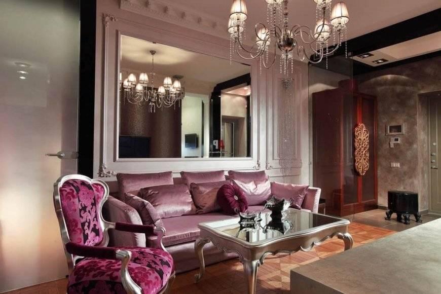 На фото неоклассический интерьер. Фиолетовые оттенки составляют оригинальный цветовой тандем с салатовым и бирюзовым.