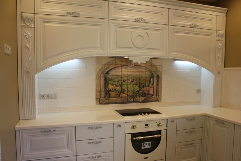 Декоративное панно из кафеля – также довольно распространенный способ украшения поверхности. В особенности хорошо такое решение смотрится в том случае, если оформление кухни выдержано в стиле прованс, кантри или классика.