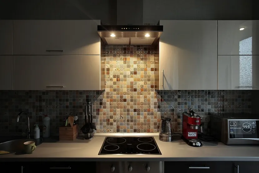 Пример интересной укладки разноцветной плитки на фартуке кухни в стиле модерн