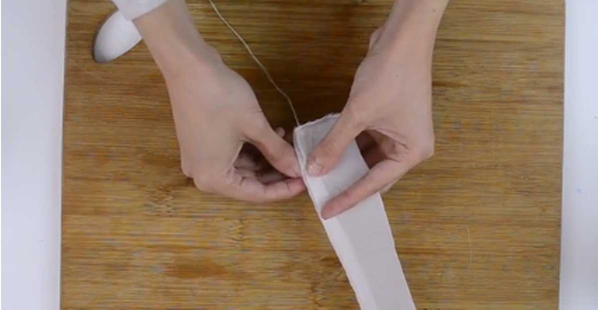 6.Пойдите вдоль длинного края ткани. Направьте иглу и узел на один конец. Выправляя длинный край ткани, где она сгибается. Продолжайте сшивать, пока не дойдете до другого конца.