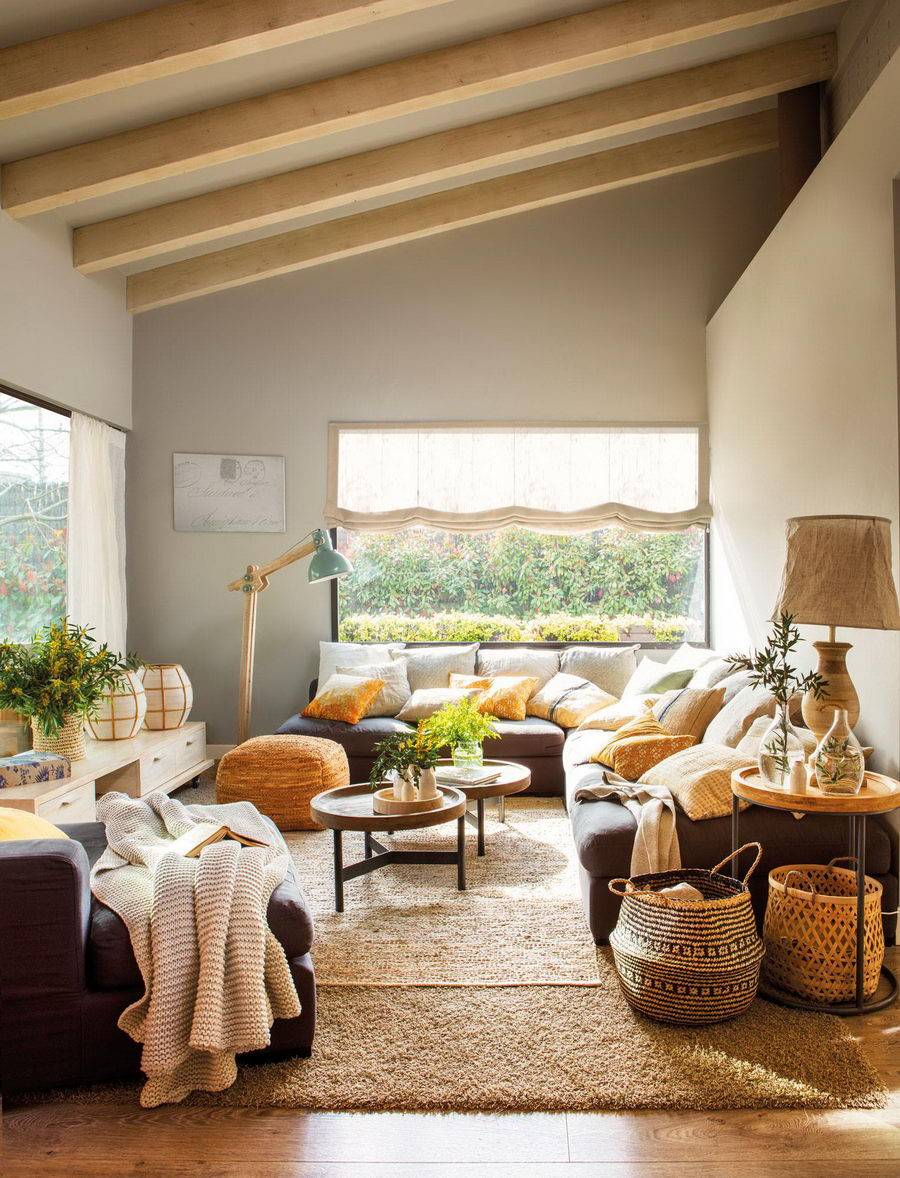 Раскидайте на диване яркие подушки контрастного цвета, расставьте декоративные свечи, источающие аромат южной ночи. Если у вас красивый пол, выполненный из материалов, напоминающих натуральное дерево, то грех закрывать его. Лучше украсьте его небольшим уютным ковром с бахромой на концах.