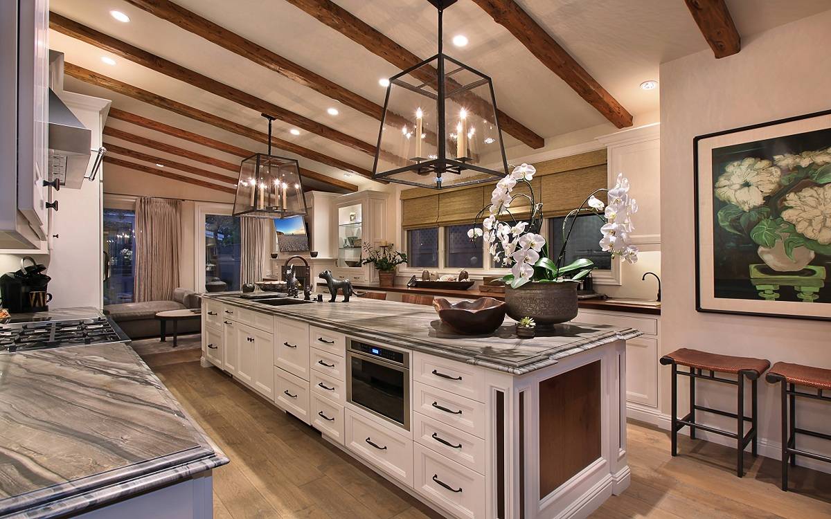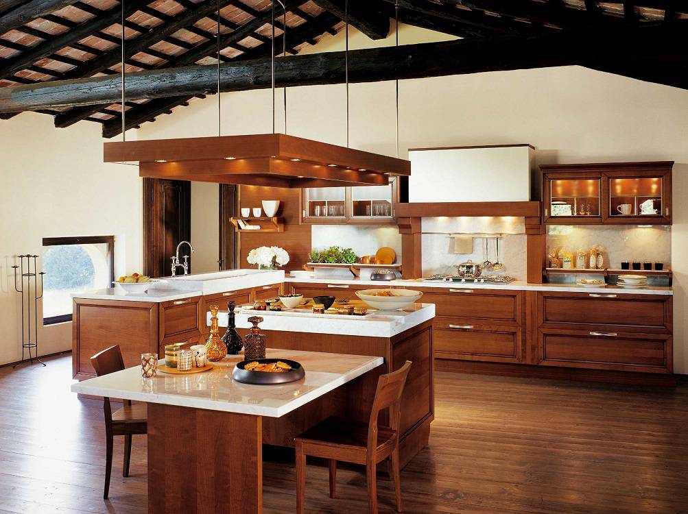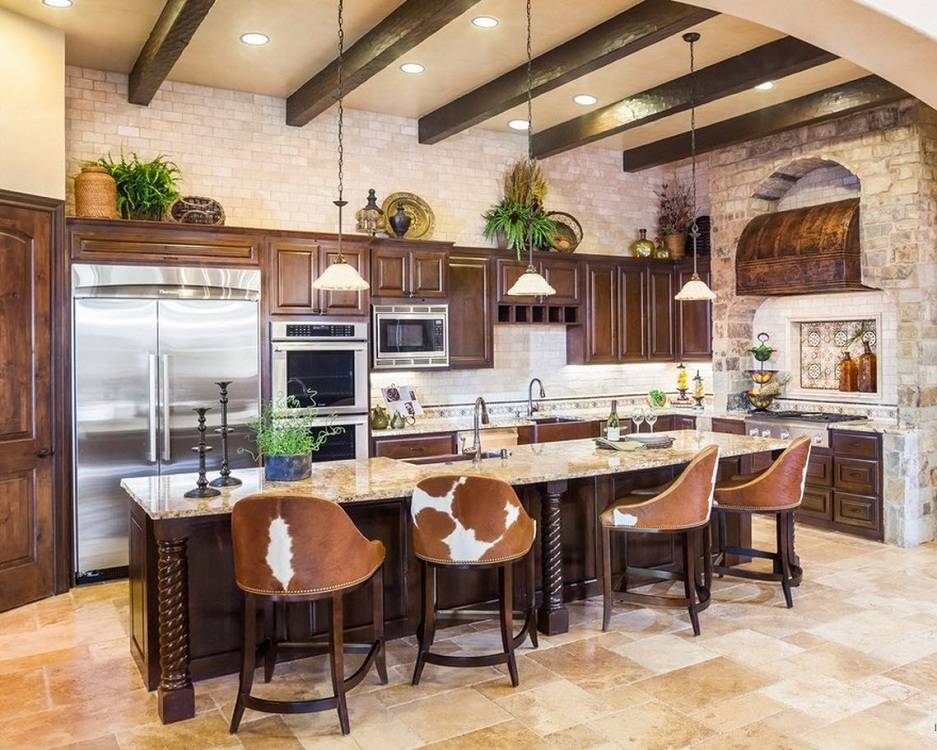 В центре кухни может быть установлен стол для приготовления пищи, вдоль стены размещают плиту и мойку. Потолок кухни чаще всего украшают деревянными балками с грубой фактурой. В качестве декора и аксессуаров используют чайники, черпаки, ковши, красивые блюда, наборы ножей, сковородки. Все это подвешивают на стены в определенном порядке или расставляют на открытые для обзора полки.