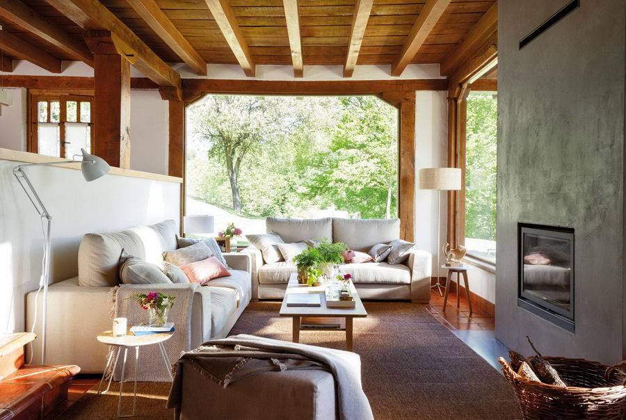 Особенность деревенского колорита может быть подчеркнута при помощи потолочных балок, которые оставляют для обозрения, окрашивая их в светлые тона.
