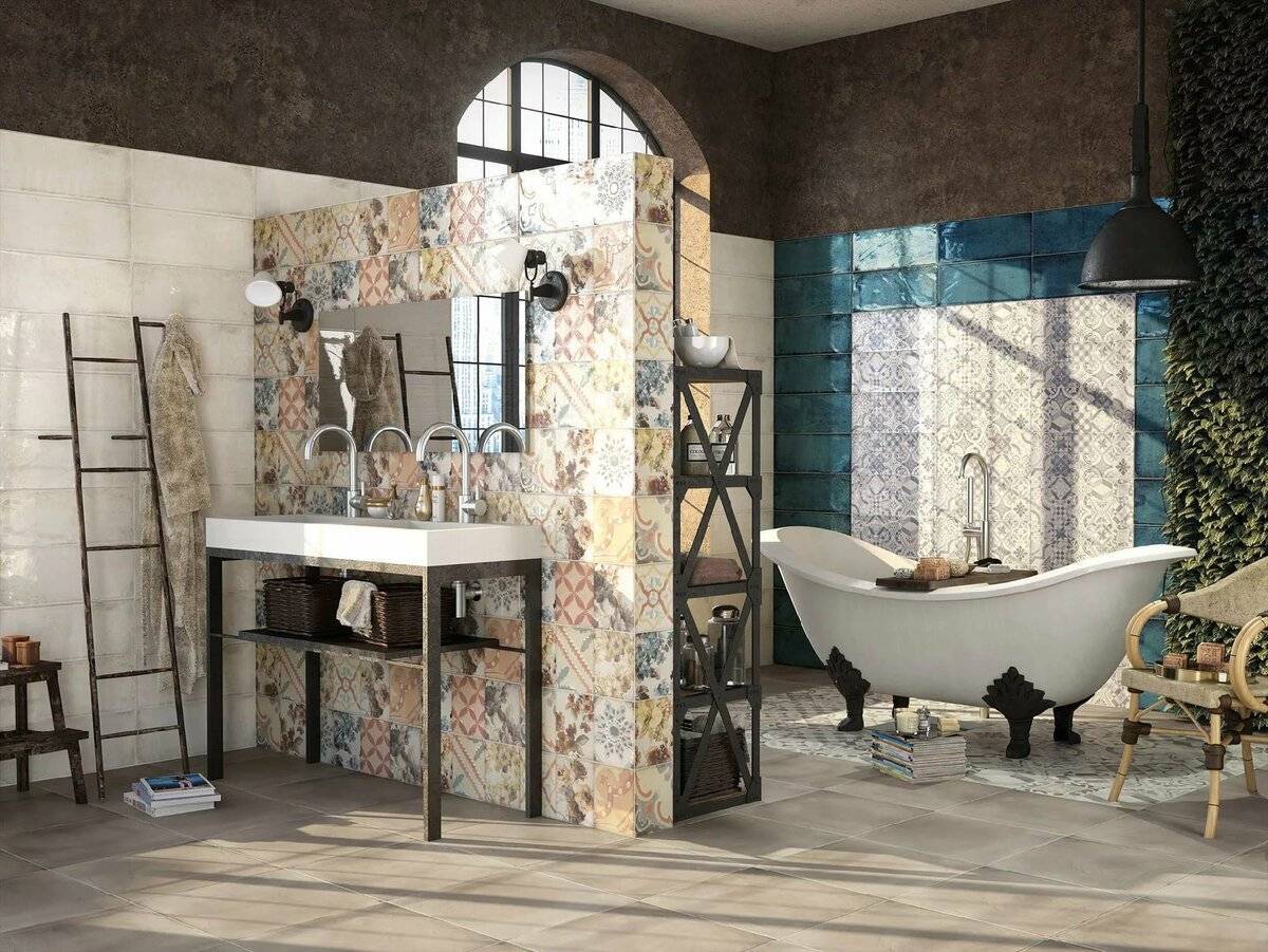 Стандартная ширина предлагаемых изделий – от 15 см и более (для квадратной плитки). Самый распространенный вариант – элементы 20х20 см. Испанская плитка можно быть и прямоугольной, например, интересно выглядит плитка 50х20 см. При выборе ее размера и формы учитывайте, что для крупногабаритных ванных комнат подойдет любой размер плитки, а вот в маленьком помещении лучше применить средний размер. Если отделать такую ванную маленькой плиткой, то визуально она станет еще меньше, а при монтаже крупных изделий почти наверняка получится много отходов, да и выглядеть большие фрагменты будут нелепо.