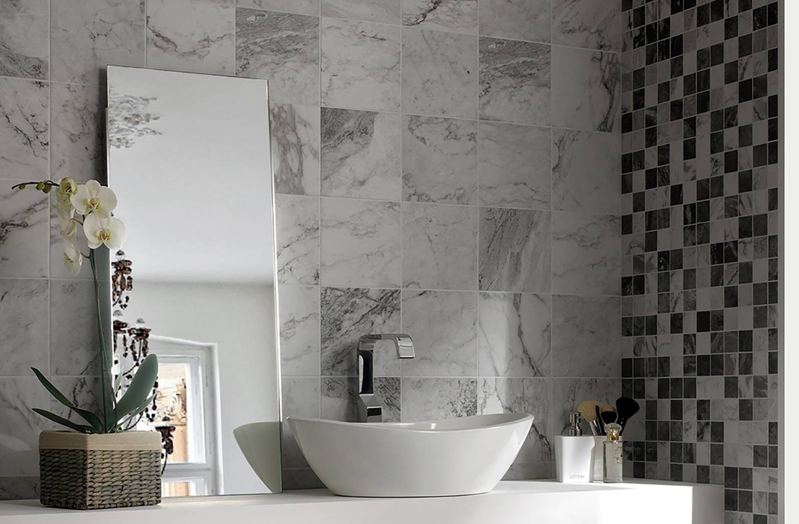 Также в качестве декора используются различные узоры, розетты, вензеля, мозаика и прочие элементы. Сейчас достаточно часто можно встретить в оформлении плитки фотопечать.