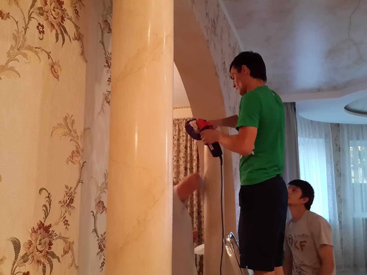 Единственное, что можно посоветовать, заштукатурить кусок фанеры площадью не менее 1 квадрата, а лучше 2-х, отшлифовать, покрыть грунтовкой и пробовать наносить венецианскую штукатурку на этой поверхности, оттачивая технику. Приступать сразу к отделке не рекомендуется. Скорее всего, придется все снимать и переделывать заново, что обидно, дорого, долго. Если повезет, можно попасть на дилеров, которые обучают работе с венецианской штукатуркой. Они предоставляют материал и стенд для работы, показывают как надо делать. Но, такое случается редко.