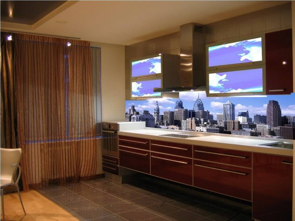 Часто фартуки из МДФ дополняют подсветкой по периметру. Такой прием делает кухню визуально выше, а дополнительное освещение облегчает кухонные работы. Если фартук изготовлен из тонкой панели, вы можете подсветить его изнутри. Особенно эффектно такая подсветка смотрится с 3Д-рисунками — они выглядят действительно живыми и украшают кухню.