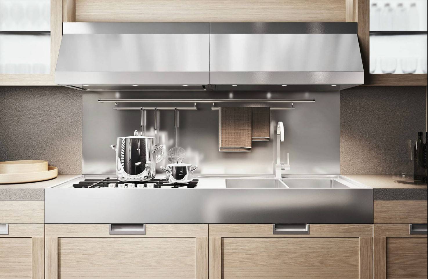 Если вы используете вытяжку, то помните о «правиле 75-80 см» — оптимальное расстояние между ней и варочной панелью. Стену за вытяжкой можно оформить в том же ключе, что и фартук. Впрочем, это дело исключительно вашего вкуса.