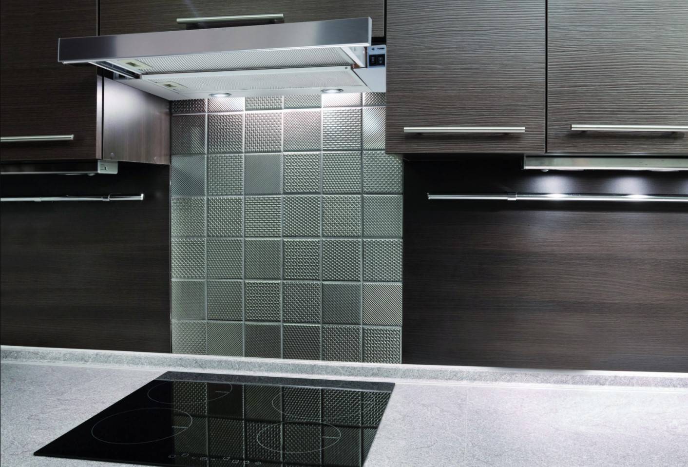 Другая крайность – стильный и дорогой , который на кухне может прослужить дольше самой мебели. Его изготовление придется заказывать индивидуально под свои размеры, если вы хотите собрать большой полноценный фартук. А вот для компактного экрана только для участка стены над плитой, быть может, удастся купить небольшие стандартные панели с проушинами для крепления. Но в целом стоимость остается та же – 6-7 тысяч за квадрат. Зато в плане практичности такой отделке равных нет.