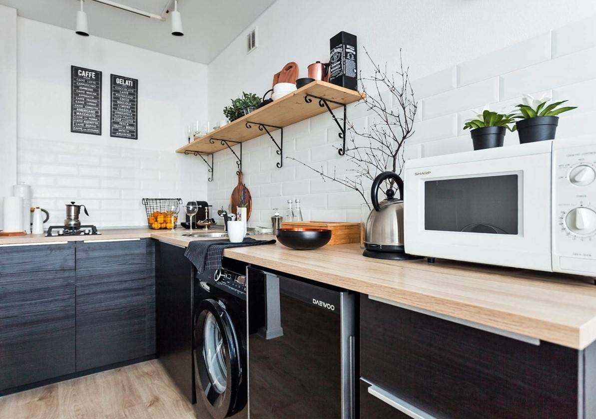 Ширина фартука зависит от типа кухонного гарнитура и почти всегда соответствует его длине: если планировка Г-образная, то продолжаем отделку по углу — и так по всему периметру.