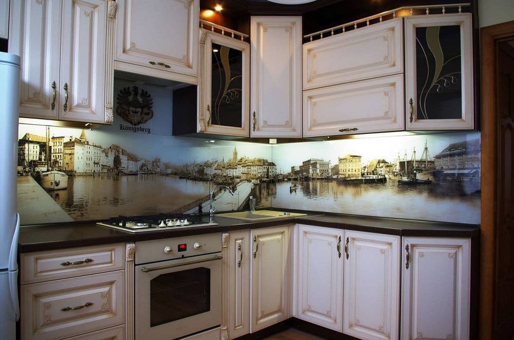 Это может быть морской берег, завораживающая линия горизонта, цветочные натюрморты, фэнтезийные сюжеты, анималистика или любой национальный узор (скандинавский, восточный, провансальный, азулежу и пр.). Универсальным цветом для фартука по-прежнему считается белый. Пластиковые панели, стекло будут отлично смотреться с гарнитуром любого цвета. Чтобы они не имели «больничный» скучный вид, дизайнеры советуют разбавить белоснежную тональность цветной вставкой из мозаики, керамического декора, фотопечати. К нейтральной гамме также относят оттенок айвори, бежевый, слоновая кость, молочный, кремовый.