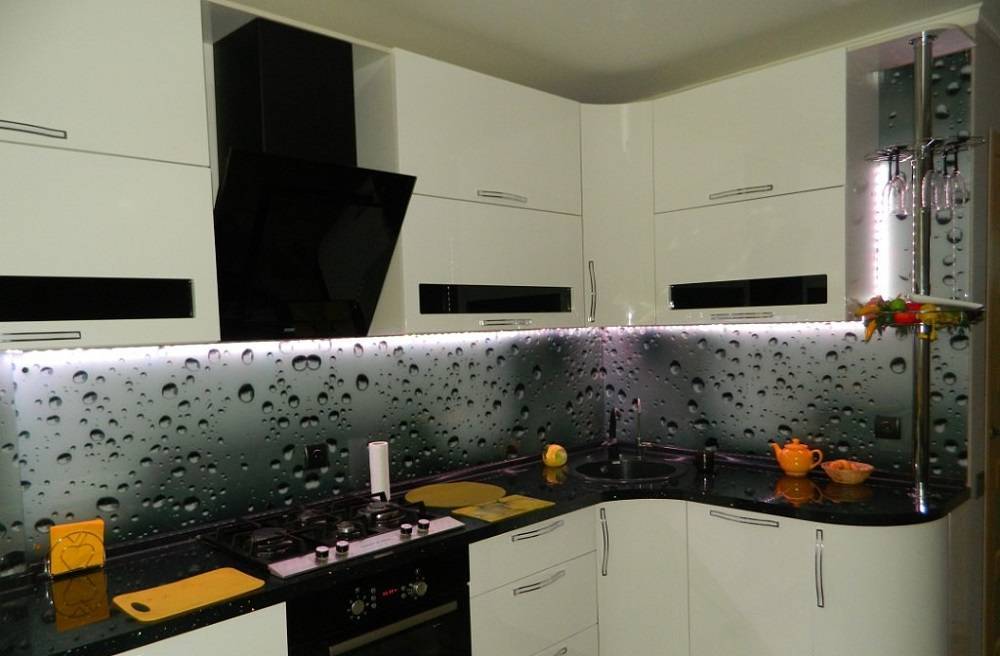 Дизайн: Фартук из акрилового стекла чаще всего оформляется фотопечатью, но также он может быть цветным (однотонным) или просто прозрачным.