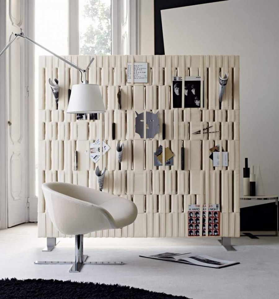 Перегородку в комнате можно оформить собственными руками. Если вы любите что-то мастерить, сделать из обычного разделителя помещения произведение искусства не составит труда. В сети можно найти множество мастер-классов по изготовлению декоративных элементов перегородки для зонирования комнаты. Задумка должна сочетаться со стилем интерьера комнаты.