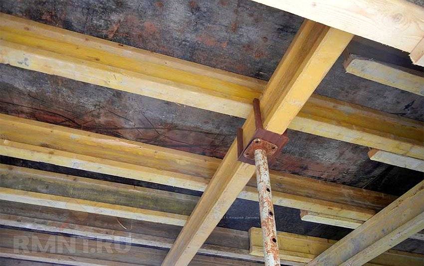 На настил и стойки с целью экономии можно пустить лес, который впоследствии будет использоваться для строительства кровли. Более дорогим вариантом будет инвентарная опалубка.