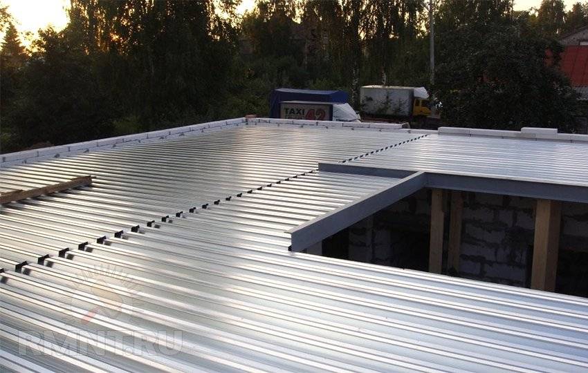 Иногда разумно делать опалубку несъемной, используя для этого профилированные листы, ориентируя их узкой полкой вниз. Их располагают вдоль плиты, чтобы волны при заливке образовывали многочисленные ребра жесткости. Расчет толщины ведется от нижнего ребра, таким образом экономия бетонной смеси составляет 20–25%. При этом высота гребня не должна превышать трети общей толщины плиты. Если опалубку снимать не планируется, в нее вкручивают саморезы с резиновой шайбой и привязывают их тонкой проволокой к арматуре.