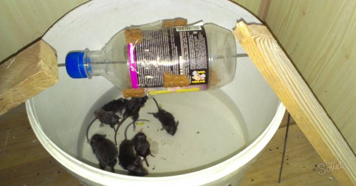 Мыши, чуя приятный запах еды, взбираются по созданному помосту на край ведра и пытаются попасть на бутылку. Из-за свойств пластика, а также из-за кругового движения на оси грызуны падают в нижний сосуд, оставаясь там до прихода хозяев. Этот вариант является одним из самых действенных и остроумных.