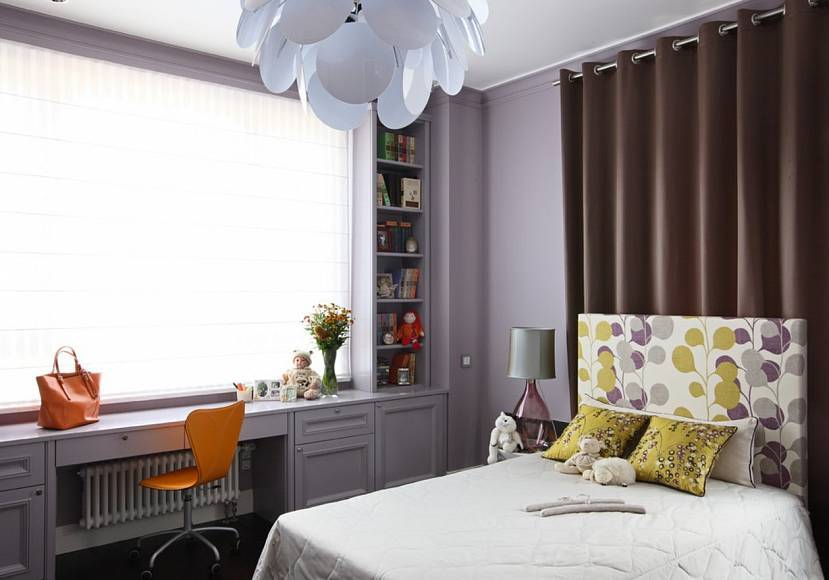 Удобным можно назвать расположение рабочего стола у кровати, вместо прикроватной тумбы. Для этих целей стоит выбирать компактную мебель, которая не будет загромождать пространство или мешать передвижению по комнате.
