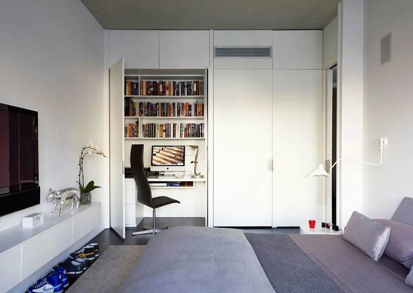 - Встроенный шкаф-купе, внутри которого можно разместить не только одежду, но и рабочий стол и несколько полок с книгами и документами.