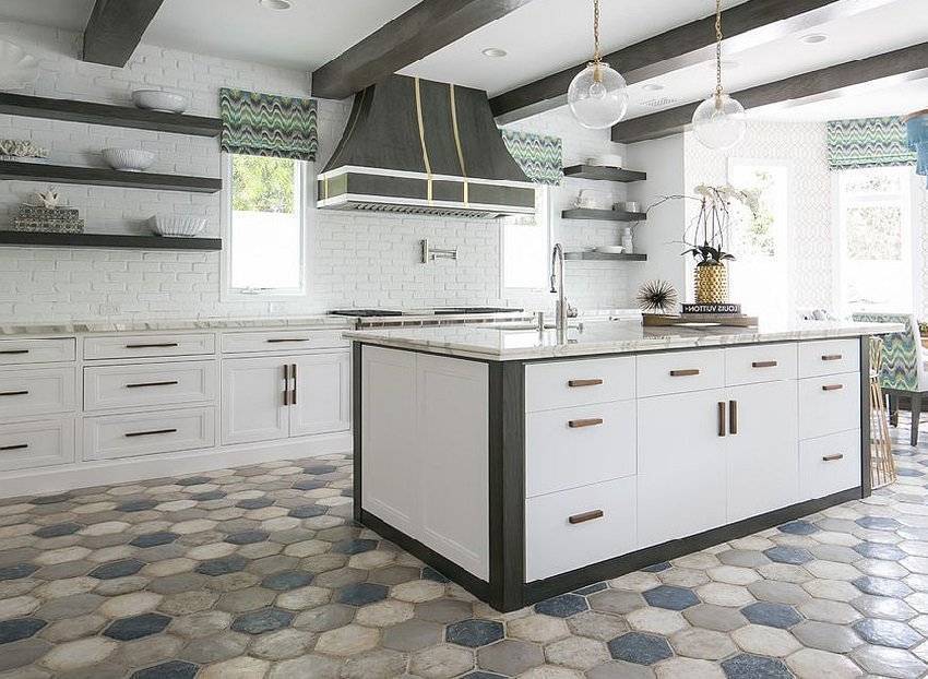 Один из самых простых способов использования – это пол. Хорошая идея заключается в том, чтобы просто покрасить стены вашей кухни или украсить их простыми плитами, а затем использовать узоры, чтобы создать фокусный взгляд под ногами. Очень популярный вид — белые стены и узорчатый кафельный пол.