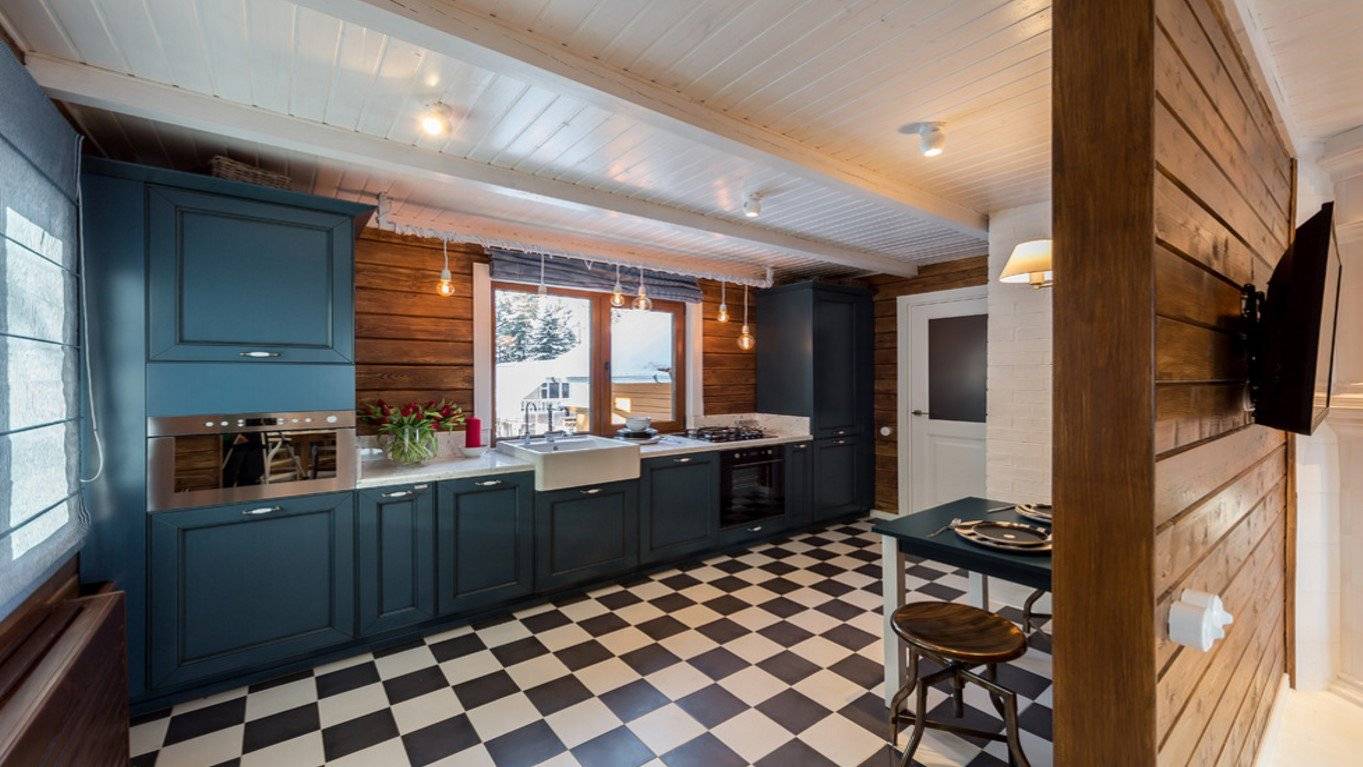 Для частного дома характерно большое кухонное пространство, которое позволяет использовать различные варианты укладки в сочетании с плиткой крупных и средних размеров.