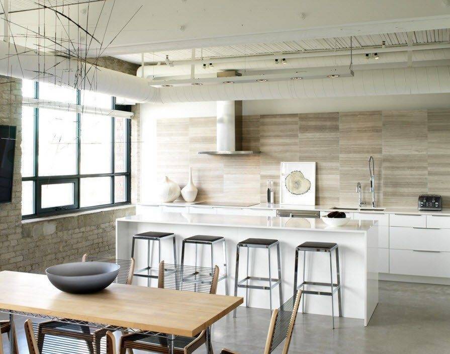 Оптимально такая комбинация выглядит в студиях, а также совмещенных комнатах, которые выполняют одновременно несколько функций – кухня+гостиная либо кухня+столовая.