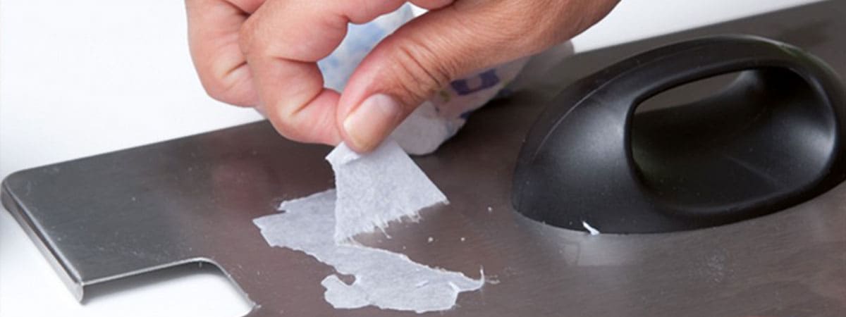 Небольшие следы клея убираем влажными салфетками, протирая загрязнения круговыми движениями до полного их исчезновения.
