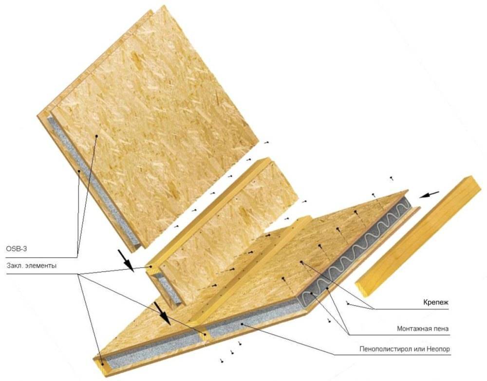 Каждая сип панель состоит из трех элементов, расположенных в виде сэндвича: OSB-3 плита + лист пенополистирола (пенопласта) + еще одна OSB-3. Все слои крепко зафиксированы между собой качественным полиуретановым клеем. Конструкция элементарная, но очень хорошо продумана и эффективна.