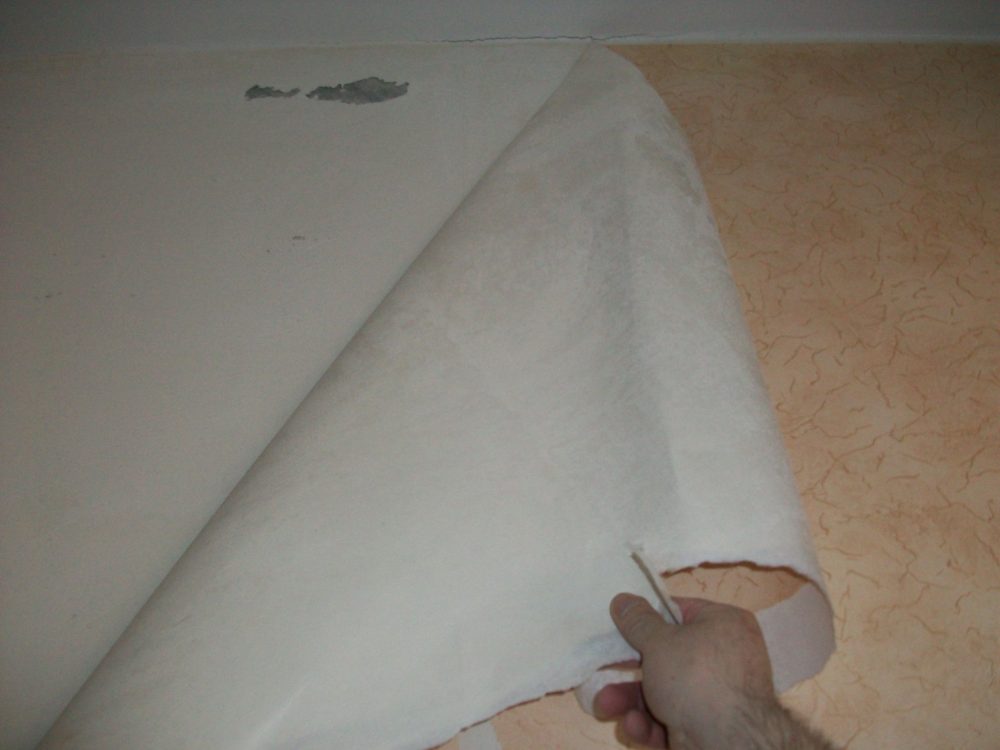 при помощи острого канцелярского ножа надрывается вверху стены кусок обоины;