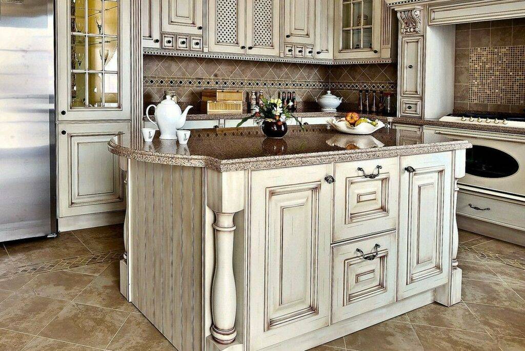 Также перед покраской гарнитура, навесные шкафы можно дополнить фигурными кронштейнами (их можно купить в готовом виде или вырезать самостоятельно), а цоколь – ножками-балясинами.