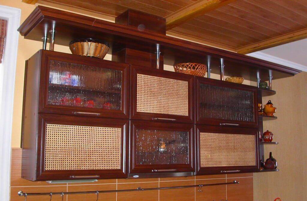 Колониальный, восточный, сафари – стили, подразумевающие структурные фасады. Ротанговое плетение заменяет стекло, надёжно защищает фасады от ударов. Влага пальмовыми решётками впитывается без коробления поверхностей. Такие качества крайне важны для кухни. Ассортимент также крайне широк: шестиугольное плетение, поперечно-продольное, комбинированное. Плюс – всевозможных расцветок.