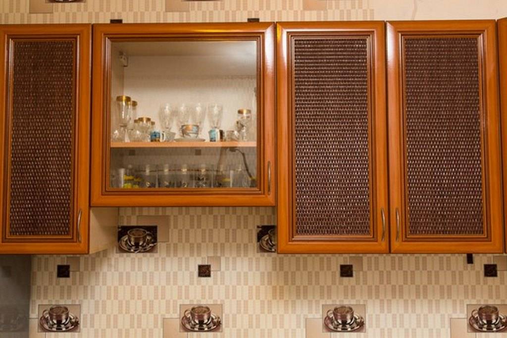 В последнее время большой популярностью пользуются вставки из ротангового полотна. С помощью этой методики покрытие фасадов приобретет новизну, преображение пойдет на пользу кухонной мебели. Прежде чем заняться облицовкой, нужно снять максимально точные замеры с поверхности, на которую будет наноситься полотно, после чего вырезать детали. Крепится ротанговое полотно с помощью строительного степлера.