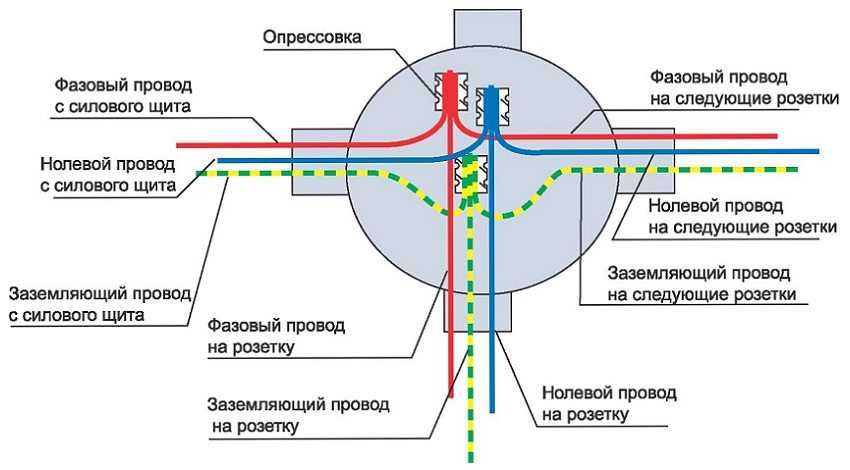 Схема соединения проводов в распределительной коробке под розетку.