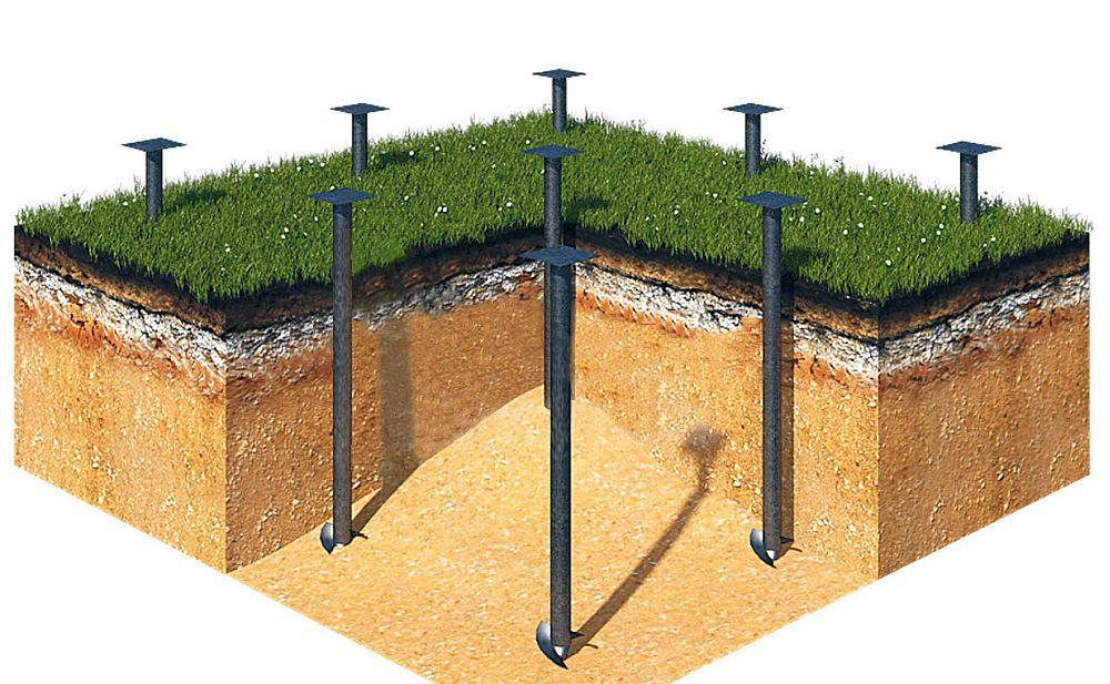 Однако более простым решением будет обустройство фундамента на сваях. Технология его возведения предусматривает вкручивание в почву свай с последующей заливкой их внутренней части бетоном. Кроме того, такой способ позволяет фундаменту «продуваться», что уберегает древесину от гниения.