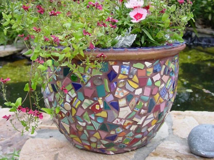 Садовый вазон, украшенный мозаикой из плитки