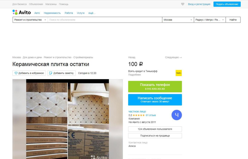 Скриншот с Авито с объявлением о продаже остатков плитки