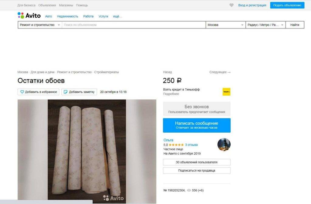 Скриншот с Avito с сообщением о продаже остатков обоев