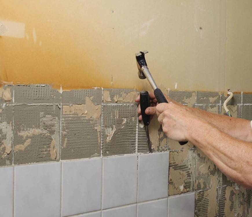 При наличии старой плитки ее удаляют при помощи зубила с молотком и перфоратора. Перфоратор значительно ускоряет процесс работы, а поддеть неплотно закрепленную плитку можно зубилом. В отличие от остальных работ с плиткой, снятие удобнее проводить сверху вниз.