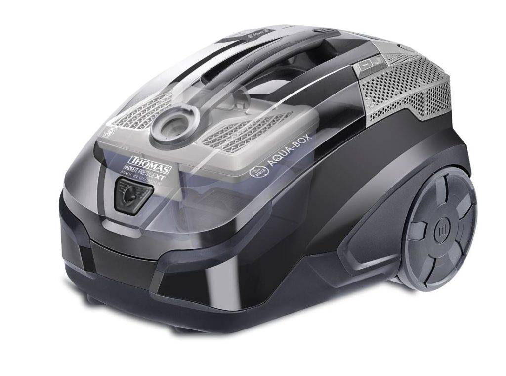 - THOMAS PERKETT Prestige XT – компактный моющий пылесос с системой водяной фильтрации Аквабокс + насадки с упругим конским ворсом и Аква Стелс для влажной уборки;