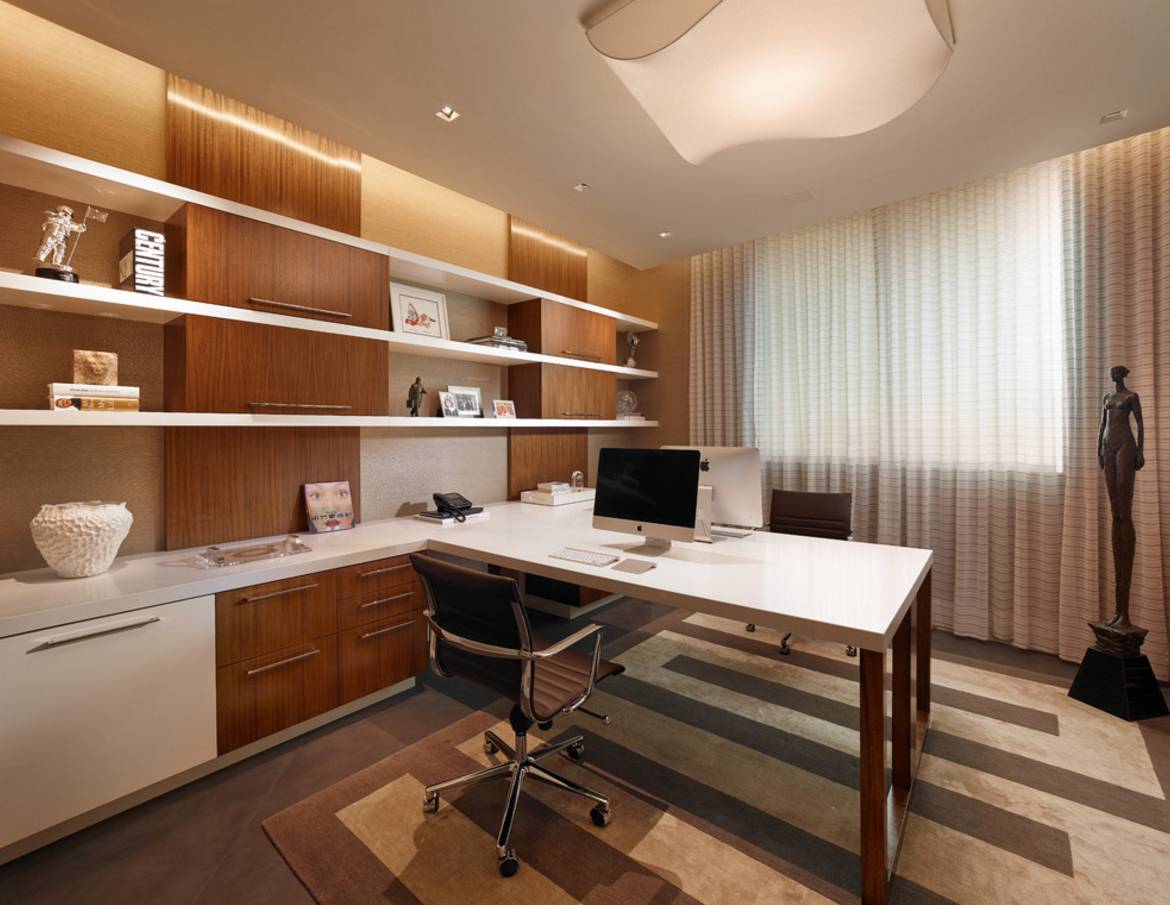 На фото интерьер кабинета в черно-белом цвете с ламинатом на полу.
