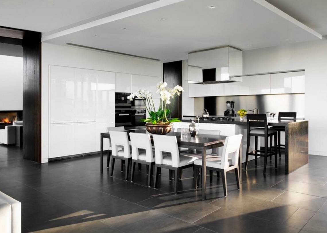 Классический вариант оформления кухни: черно-белый дизайн. Лучшим по практичности решением для напольного покрытия: керамическая плитка или керамогранит.