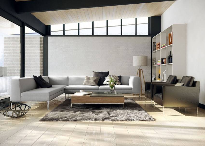 Для одиноких людей или молодой семьи отличным решением будет использование в оформлении современного стиля. Дизайн такой гостиной получится легким, модным и функциональным. Преобладающими тонами будут любые светлые или холодные оттенки.