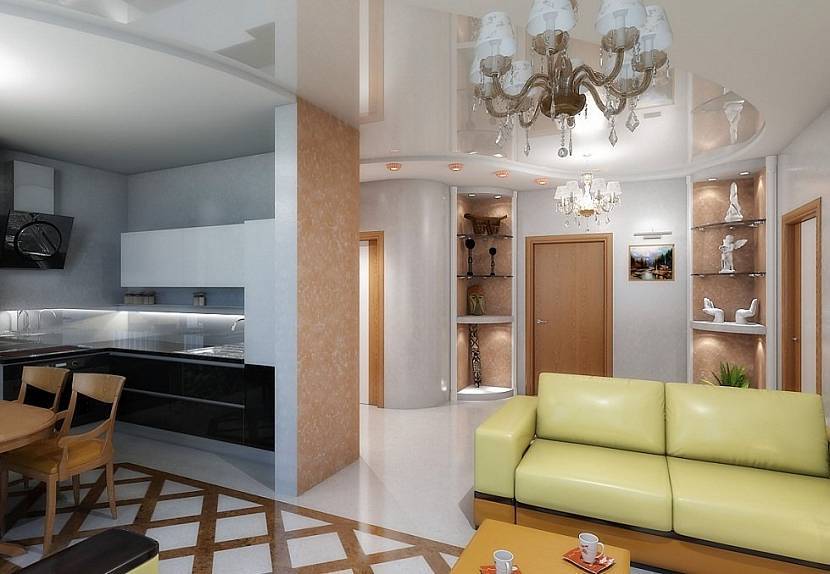 Освещение лучше сделать точечное, расположив софиты по всему периметру комнаты. Очень стильно и современно будет смотреться прием объединения комнаты с кухней, путем сноса перегородки. Вариант гостиной-студии очень моден и востребован в настоящее время.